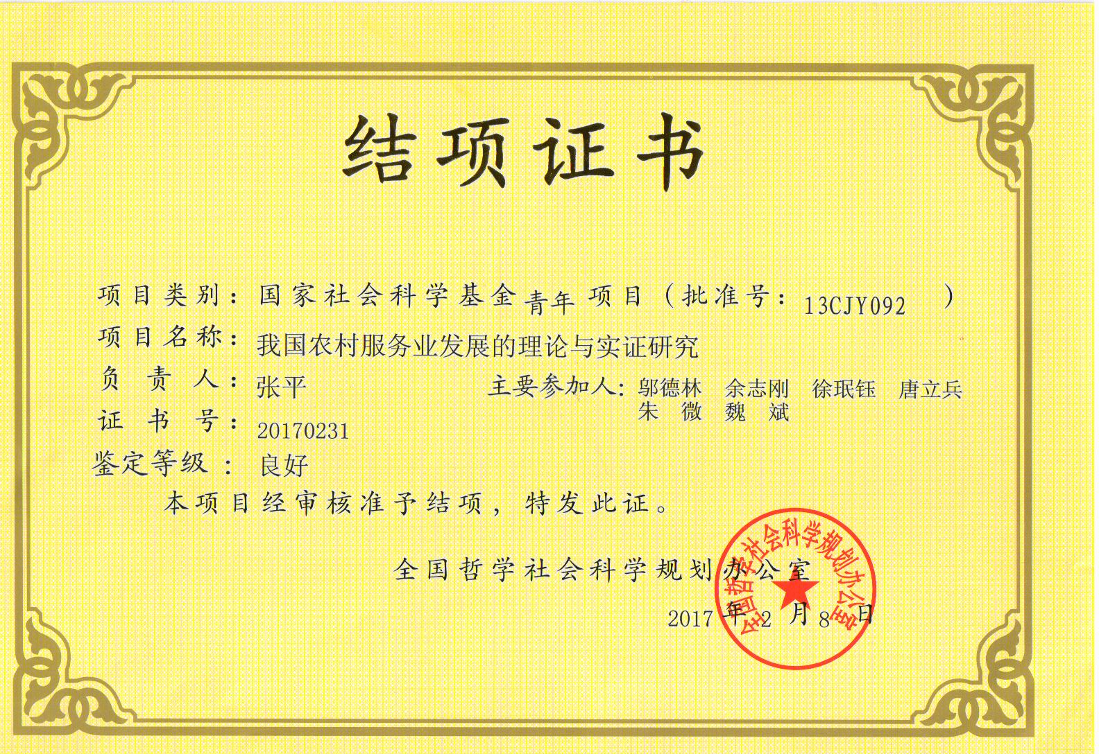 日前,从国家社科基金办获悉,由经济管理学院张平教授主持的国家社会科学基金项目“我国农村服务业发展的理论与实证研究”已经顺利通过结项鉴定,等级为“良好”。