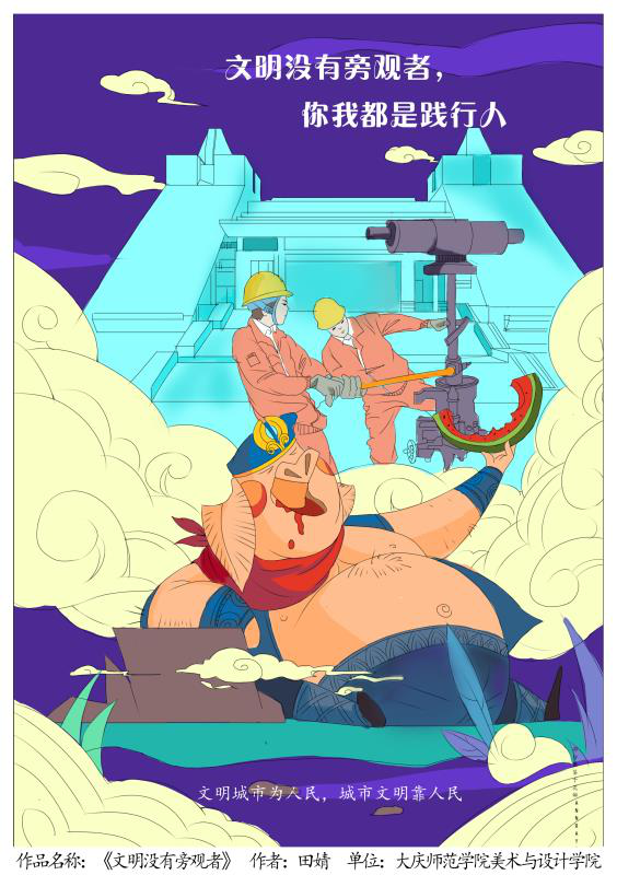本次活动吸引了在校师生们的广泛参与,虽然疫情期间存在如创作设备不足、指导不便等诸多挑战,但大家心往一处想,劲往一处使,克服困难,加班加点,在短短的一周时间内创作完成了漫画、插画、数字绘画、装饰绘画、卡通绘画等共计1172件作品。为了确保作品质量,提升活动效果,美术与设计学院还组织教师进行了严格、认真的评选,最终向让胡路区委宣传部提交了546件。通过此次活动开展,一方面有效提高了学生学习的主动性,调动了学生创作的积极性,以“实战”锻炼了专业综合能力;另一方面形式新颖、创意独特的美术作品发人深省,在极大程度上进一步引导市民崇尚文明,倡导文明,提高素质,规范行为,不断提升城市文化品位,营造了浓厚的创建氛围。(撰稿:陆津 审核:孙大力)