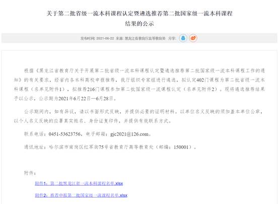 6月22日,省教育厅对第二批省级一流本科课程认定暨遴选推荐第二批国家级一流本科课程结果进行了公示,教育厅拟认定省级一流本科课程402门,拟推荐参加国家一流本科课程认定的课程216门。在教务处精心组织下,经课程教学团队申报、学校推荐,省教育厅组织评审,我校数学科学学院李唐海教授团队主讲的《数学微格教学》课程、文学院任金凤教授主讲的《中国话剧研究与实践》课程、法学院付媛副教授团队主讲的《法庭教学》课程拟被推荐参加第二批国家级本科一流课程评审,我校法学院付媛副教授团队主讲的《法庭教学》课程、计算机科学与信息技术学院缪丽萍副教授团队主讲的《现代教育技术》、文学院任金凤教授主讲的《中国话剧研究与实践》课程、机电工程学院成宝芝教授团队主讲的《模拟电子技术》、数学科学学院郭爽教授团队主讲的《常微分方程》、机电工程学院何巍巍团队的《弗兰克-赫兹仿真实验》6门课程拟被认定为黑龙江省一流本科课程,我校认定课程数量在省内同层次院校中名列前茅。