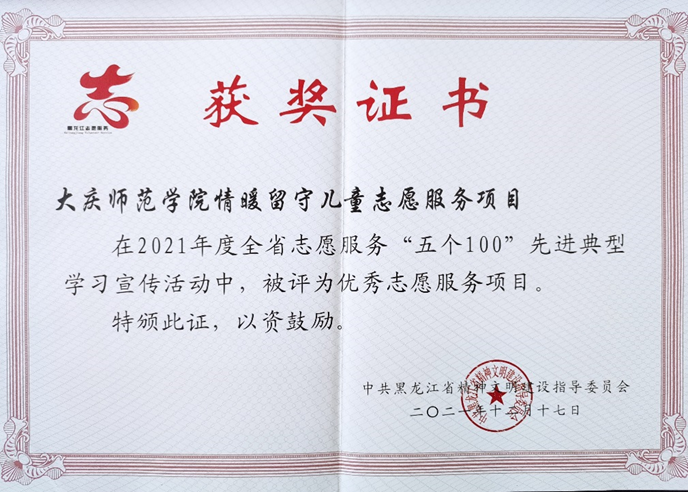 近日,中共 黑龙江省精神文明建设指导委员会发布了2021年度全省志愿服务“五个100”先进典型学习宣传活动评选结果,我校“情暖留守儿童志愿服务项目”荣获优秀志愿服务项目。