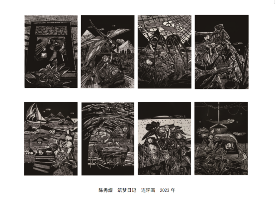 五年一届的全国美术作品展览诞生于新中国成立之际,与共和国发展同行,是目前规模最大、参与范围最广、作品种类最多、最具影响力的国家级综合性美术大展。今年适逢中华人民共和国成立75周年,本届全国美展既是对五年来美术创作成果的一次集中呈现,也是美术界为庆祝新中国成立75周年献上的一份厚礼,得到了广大美术工作者的积极参与和社会各界的广泛关注。陈秀煜的连环画作品《筑梦日记》以超现实主义的形式抒发孩童天真、浪漫、自由自在的思想情怀,在表现形式上,采用了黑白木刻的语言形式,追求一种单纯而质朴,叙事而抒情的艺术风格;王迪的版画作品《行·途》在题材上选择道路工程的修缮等基础设施建设成就,以水印木刻为媒介,传递出人民对美好生活的向往。