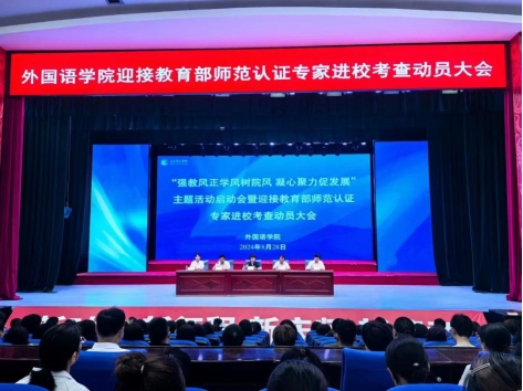 8月28日,外国语学院在大学生活动中心召开了“强教风正学风树院风,凝心聚力促发展”主题活动启动会暨迎接教育部师范认证专家进校考查动员大会。学院领导班子成员、全体教职工及学生参加了会议,会议由学院党总支书记邱晓东主持。