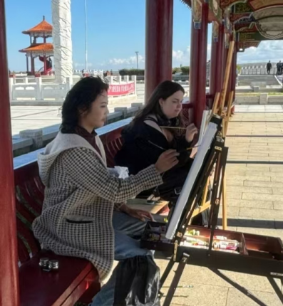 在为期7天的采风创作中,中俄师生们分别来到了东极阁、滨江公园、乌苏镇抓吉赫哲族村、东极广场等地,她们或漫步公园,将生态与人文之美呈现在画布之上;或驻足于赫哲村落,用画笔描绘着悠久的历史和淳朴的民风;或流连于风景如画的江畔,捕捉着水面上闪烁的光影。每一笔每一划,都是对艺术感悟的深情告白,更是对中俄友好情谊的真挚表达。