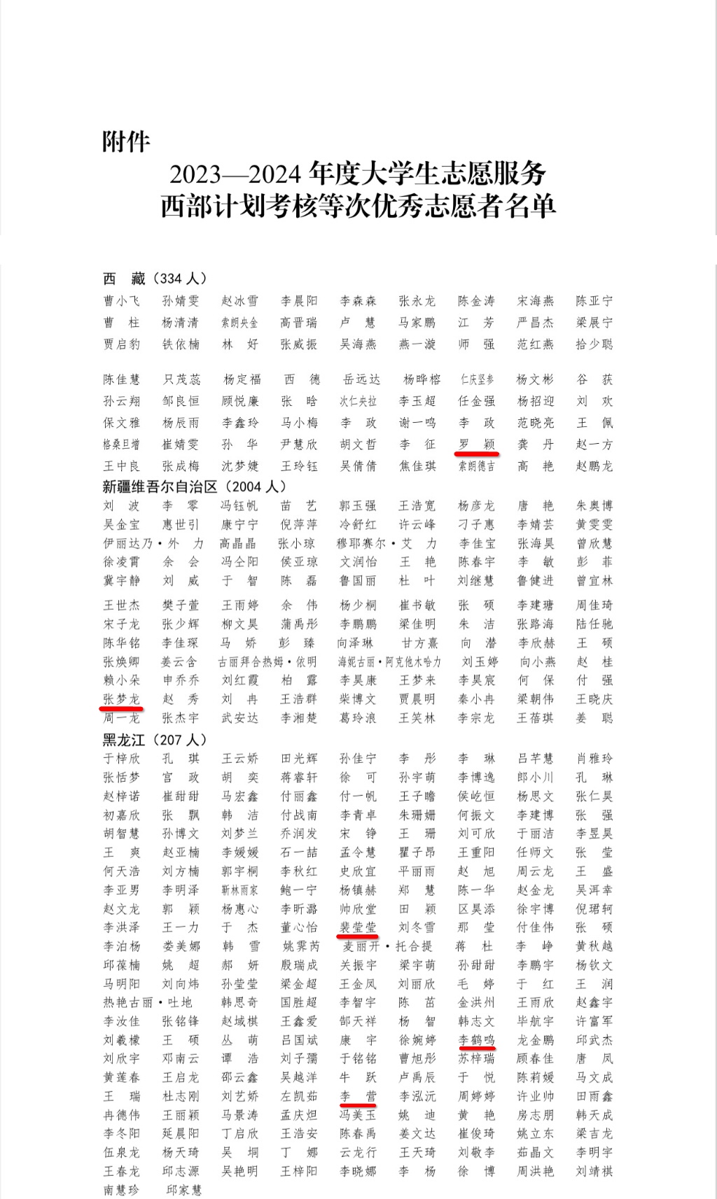 近日,全国大学生志愿服务西部计划项目管理办公室公布了《关于印发2023-2024年度大学生志愿服务西部计划考核等次优秀志愿者名单的通知》(全国项目办发〔2024〕4号)。我校毕业生裴莹莹、李鹤鸣、李营、张梦龙、罗颖5名西部计划志愿者获评2023-2024年度大学生志愿服务西部计划考核等次优秀志愿者。
