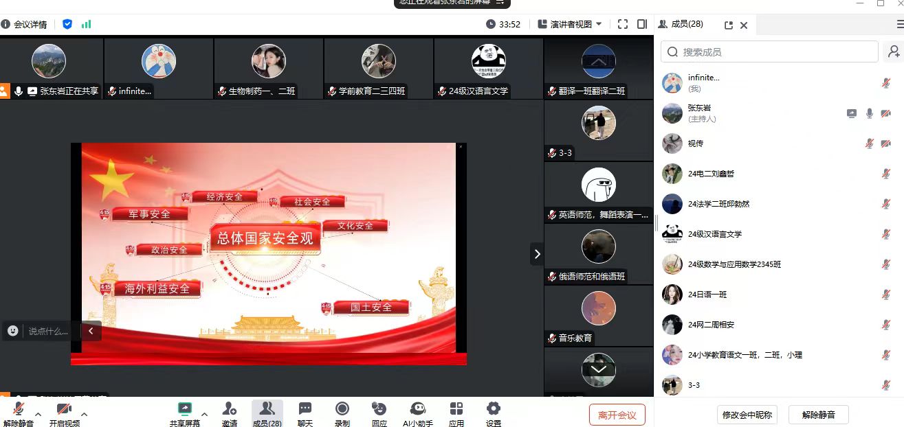11月27日下午,我校《国家安全教育》课程正式开课,教务处邀请专业人士杜老师为2024级全体学生做《切实增强师生反间谍安全防范意识扎实筑牢国家安全人民防线》的专题讲座,讲座采取同步直播的方式进行,主报告在主楼1-2进行,同步27个主楼教室共计3000余人在线观看。讲座由《国家安全教育》课程教研室主任张东岩主持。
