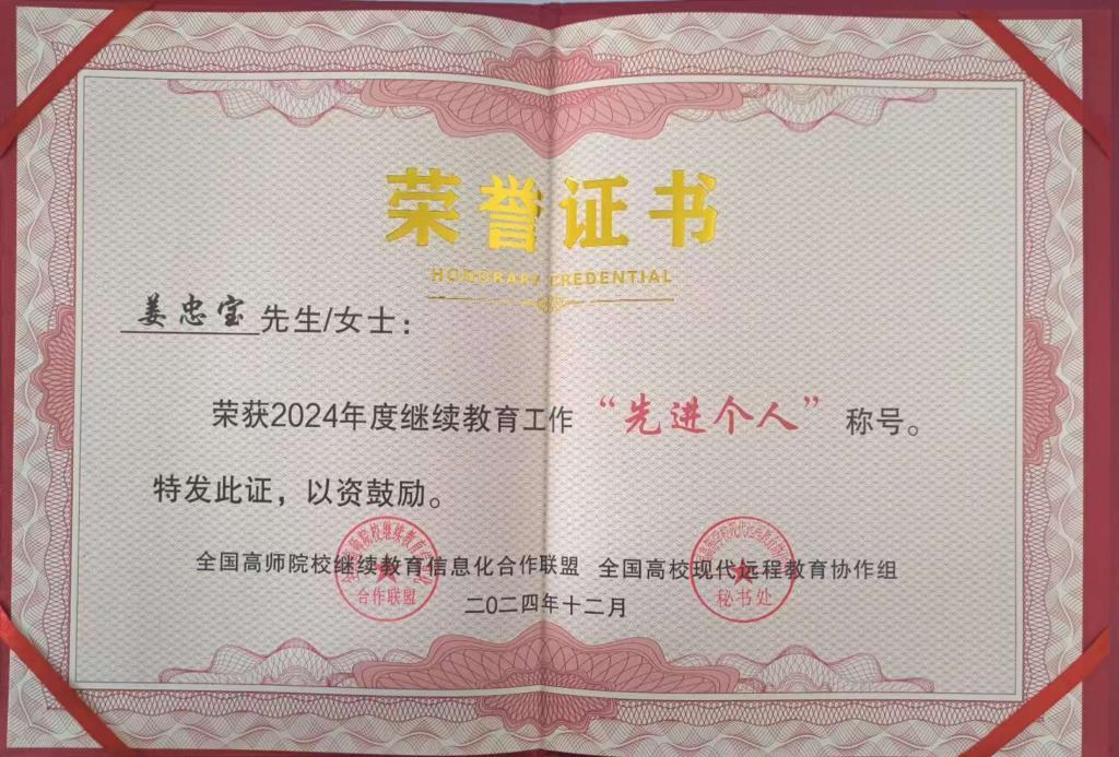 会议对2024年度继续教育工作先进集体和个人进行了评选和表彰。我校继续教育学院荣获2024年度继续教育工作先进集体,姜忠宝老师荣获2024年度继续教育工作“先进个人”称号。