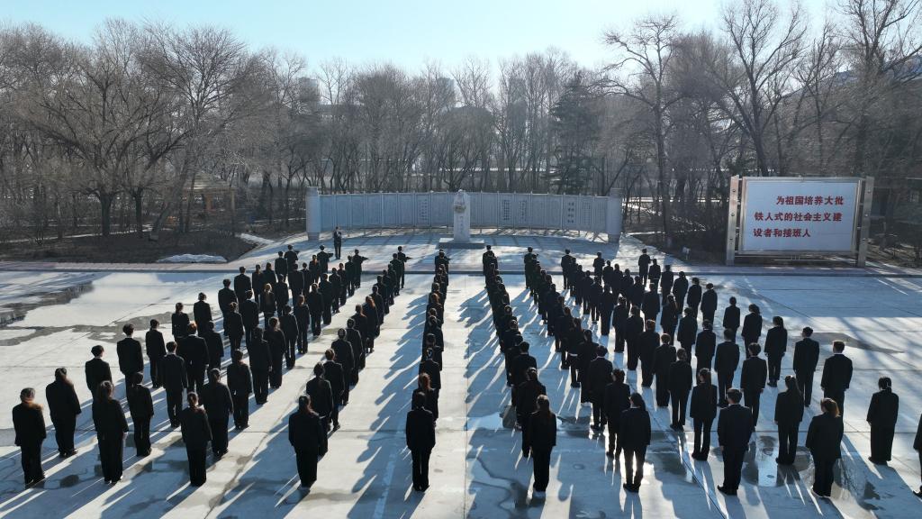 仪式现场,8位“新时代铁人式标兵”依次完成绶带整理、鲜花敬献等环节,铿锵有力的集体宣誓在纪念馆穹顶回响。当《踏着铁人脚步走》高亢的旋律响起,全体人员以歌声唱响薪火相传的信念。青年学子手捧白菊列队献花,九十度深躬寄托着赓续精神血脉、勇担时代使命的坚定承诺。