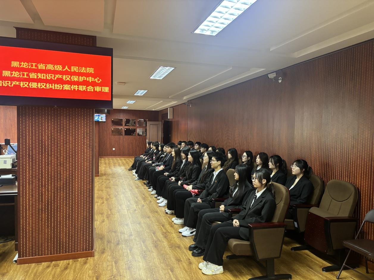 在黑龙江省知识产权保护中心的协调下,法学院30名师生走进庭审现场,旁听了一起商标侵权纠纷案件的公开审理。庭审过程中,学生们全程观摩了举证质证、法庭辩论等关键环节,直观了解了知识产权案件的审理流程和司法裁判标准,使得“课本上的法律条款在庭审中‘活’了起来,对侵权认定、证据规则有了更深刻的理解。