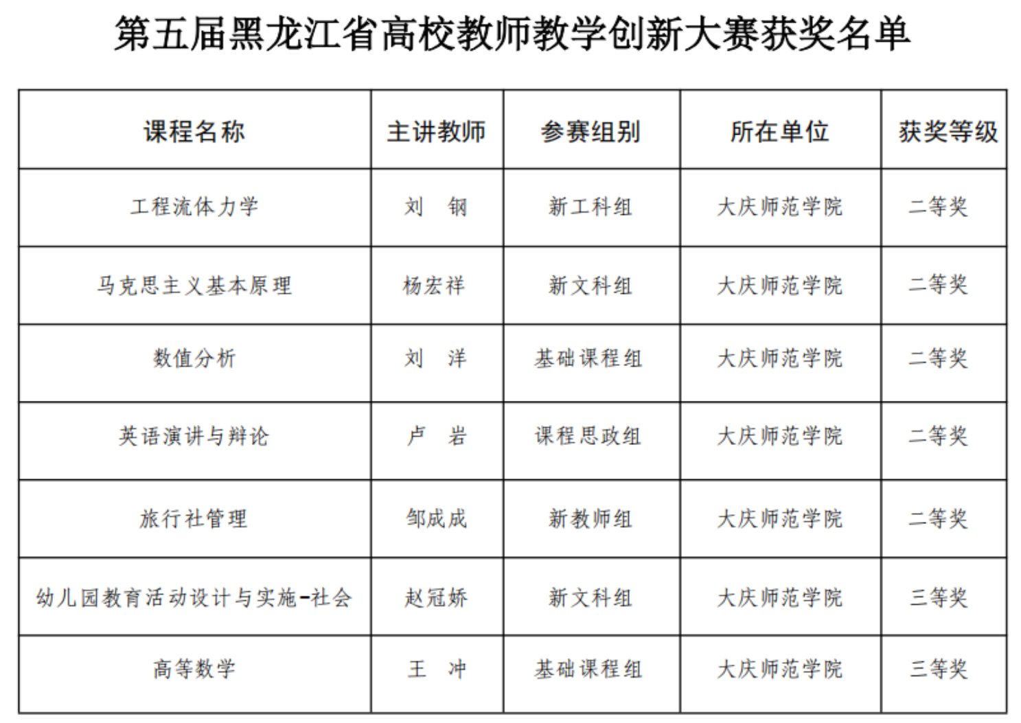 由黑龙江省教育厅主办的第五届黑龙江省高校教师教学创新大赛落下帷幕。我校7名教师分别荣获二等奖5项、三等奖2项,1名教师入选国赛选拔赛第一轮集训营。