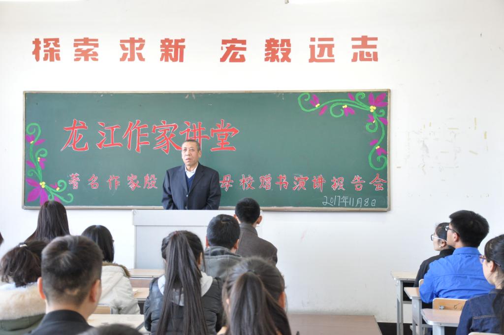 11月8日下午,文学院80届优秀毕业生、著名作家殷庆功先生回到母校,探望2017级汉语言文学专业二班全体学生,并赠送给文学院师生其创作的长篇小说《父子》等作品100余本。图书捐赠仪式之后,殷庆功先生为北辰文学社成员及文学院2017级汉语言文学二班全体同学做了题为“让创作成为人生的壮丽诗篇”的报告。报告会由文学院院长助理原昊博士主持。