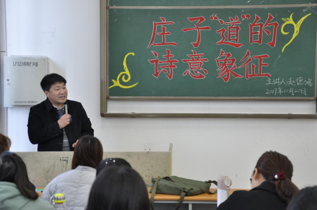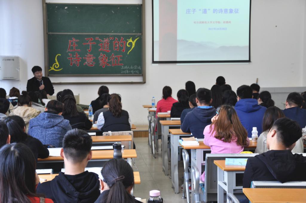 10月20日,文学院邀请中国文艺评论家协会会员、黑龙江省文艺评论家协会理事、哈尔滨师范大学文学院硕士研究生导师赵德鸿教授在主楼111教室做了题为“庄子‘道’的诗意象征”的学术报告。文学院院长赵丽教授出席了报告会,文学院2016级汉语言文学专业全体学生聆听学习。报告会由文学院院长助理原昊博士主持。
