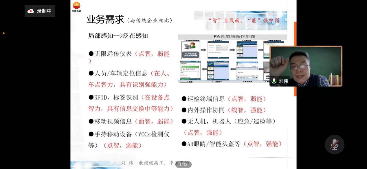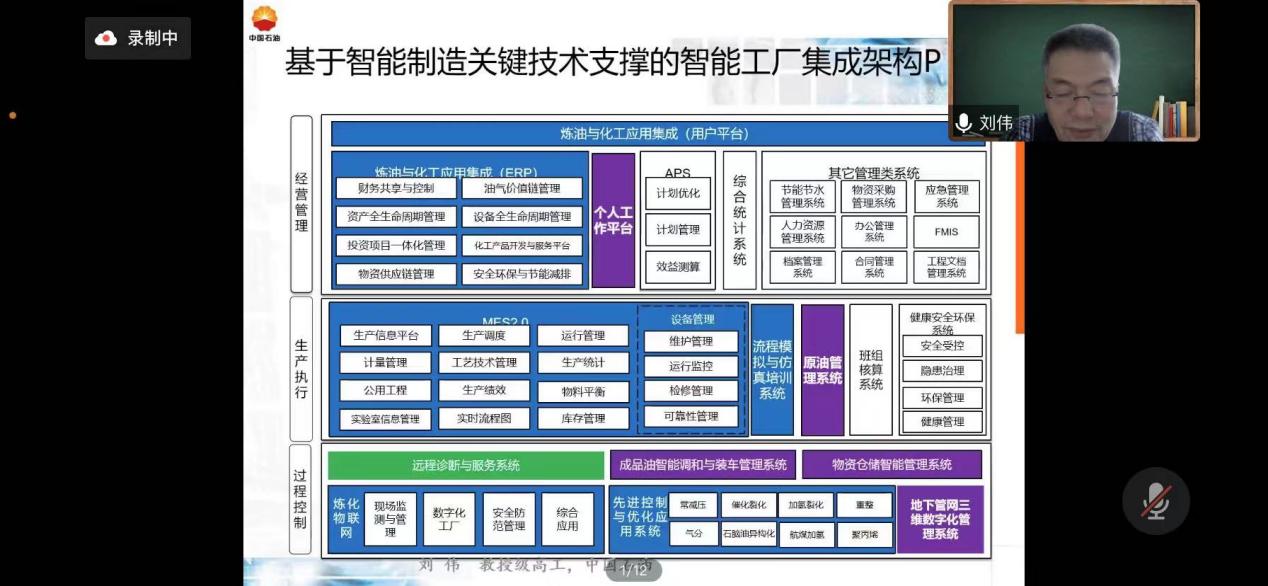 2022年10月26日下午,计算机科学与信息技术学院企业家讲坛在线上举行,本期论坛由计算机科学与信息技术学院主办。中国石油炼化板块智能化总体专家组顾问,大庆石化信息技术原中心主任、副总工程师、东北石油大学(自动化、计算机应用专业)兼职教授、研究生导师,教授级高级工程师刘伟应邀担当本期讲坛主讲专家,刘伟教授以“智能制造关键技术”为题,对石油石化企业在新一代信息技术应用于设计、生产、管理、服务等制造活动各个环节,如何缩短产品研制周期、降低资源能源消耗、降低运营成本、提高生产效率、提升产品质量等问题进行了阐述。计算机科学与信息技术学全体教师、相关学院部分教师和学院2019级、2020级部分学生聆听了讲座。