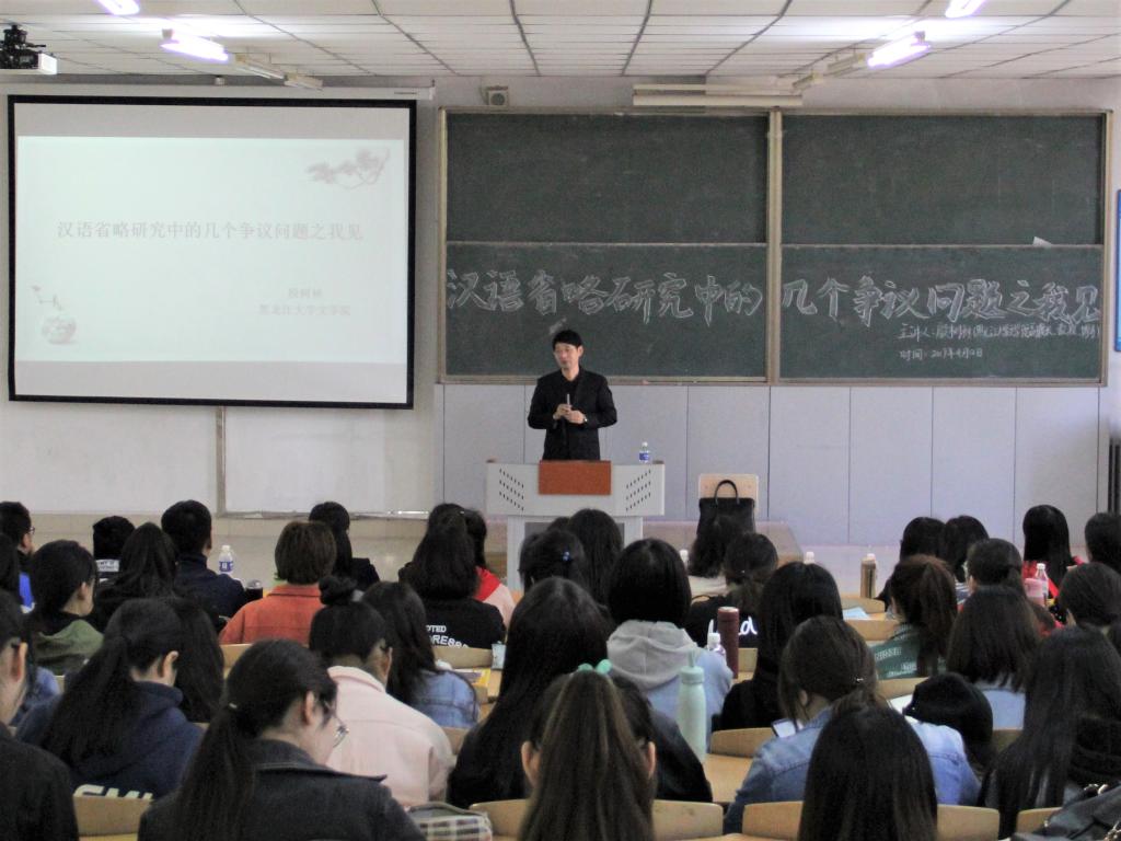 殷树林教授以“汉语省略研究中的几个争议问题之我见”为题,梳理了关于汉语省略研究的起源、发展历程、现代研究状况、及目前存在的争议等背景,向同学们介绍了汉语省略研究的基本情况。殷教授指出,有关汉语省略的学术研究自汉代郑玄以来,历代学者站在前人的基础上,针对不同的领域提出了各种独创性观点,并由此产生了长久以来的学术争辩,推动着汉语省略研究的学术进步与发展。殷教授以关于附加成分省略问题、关于宾语省略问题、关于“的”字结构省略问题为主题,结合郑玄、王力、郭中平、张志公、王维贤、范开泰等古今知名学者的观点,提出了自己对于汉语省略的独创思考与崭新的观点。殷教授的语言风趣生动、讲课深入浅出、引人入胜,同学们不由得沉醉其中,感到收获很大。讲座最后,殷教授向同学们详细介绍了有关研究生入学考试的情况。在互动环节中,殷教授为致力于考研的同学答疑解惑,同学们积极参与,就自己在专业课、讲座内容、考研等方面的疑惑向殷教授提出问题,殷教授结合自己扎实的学术素养与多年的工作经历向同学们进行了明晰的阐述。
