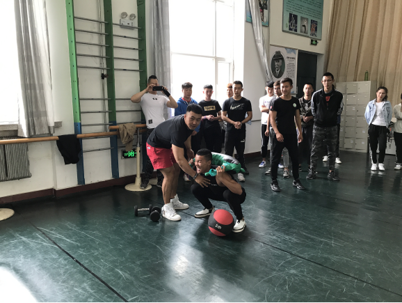 报告结束后,林子轶先生与学生进行了交流,并为我校健美队和社会体育指导与管理专业学生上了一堂动作示范课。课上他为学生制定了WOD(work of Day),并以利用药示翻站、实力推、牛角包实蹲、Burpee、plank作为教学内容,以实例说明了传统健身与Crossfit的区别,并为同学们指出健身训练过程中容易出现的不规范动作,最后对易造成损伤的错误动作进行了纠正。