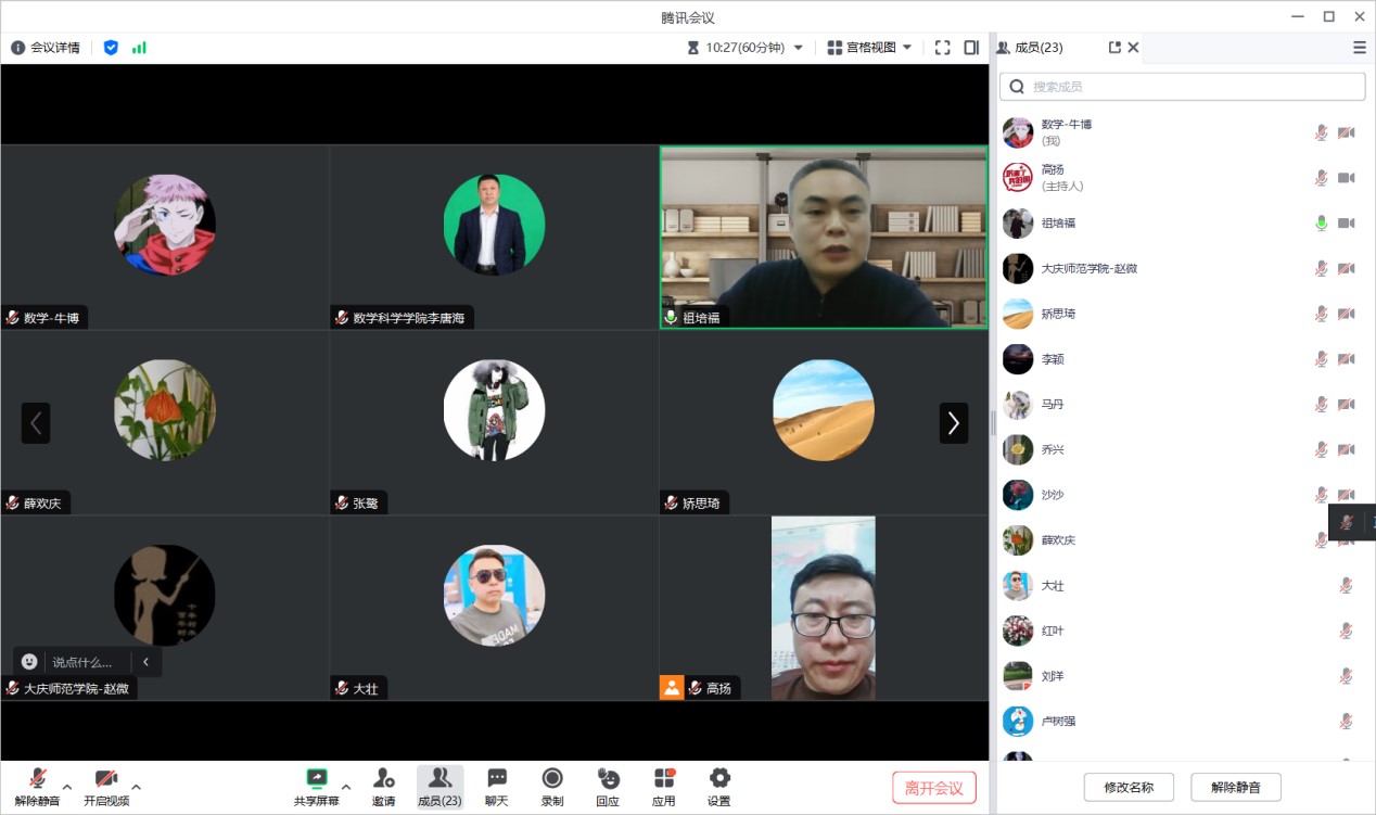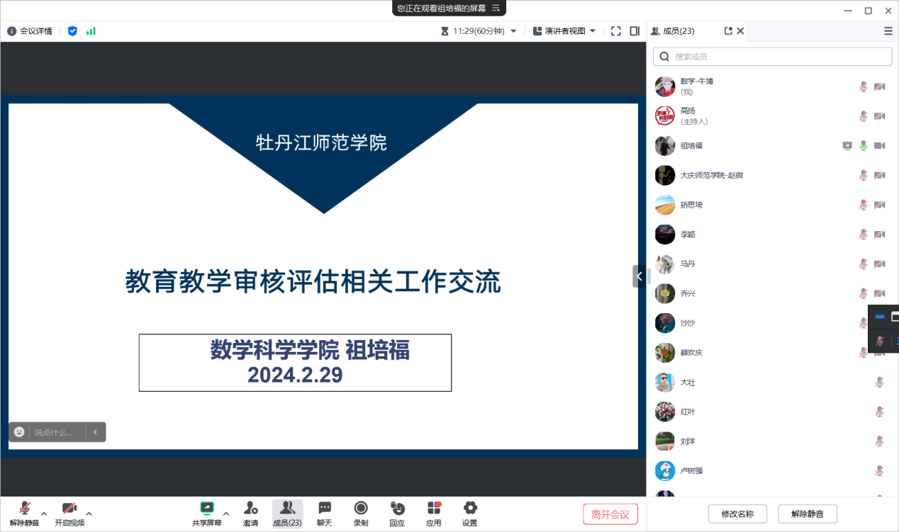 2024年2月29日晚19:00-20:30,数学科学学院在腾讯会议线上举行了"教育教学审核评估工作交流"线上专题报告会.本次报告会邀请了牡丹江师范学院数学科学学院祖培福副院长,数学科学学院全体教师参加了报告会。