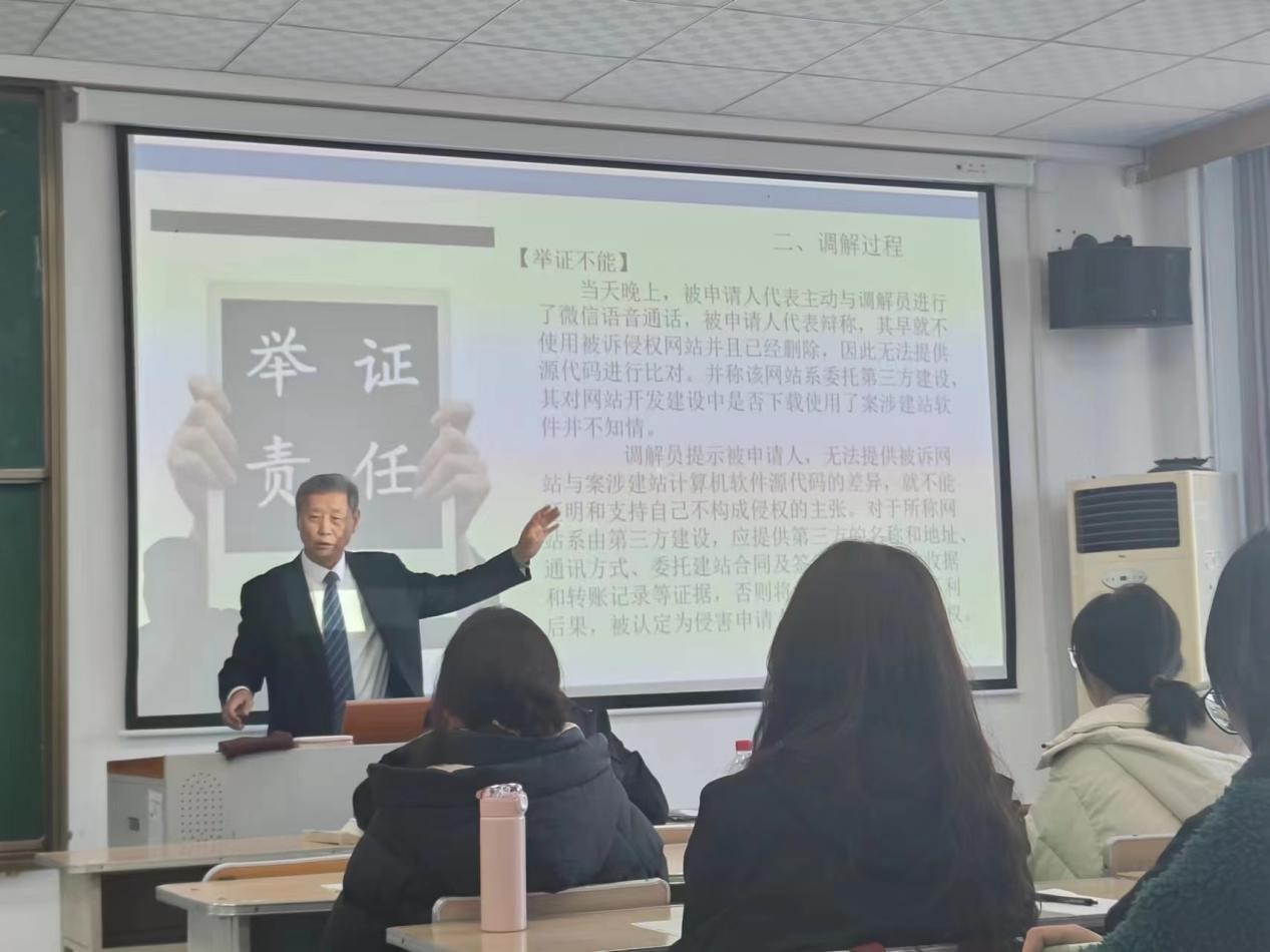 王源泉老师以幽默风趣的语言为学生讲解知识产权专业知识,通过案例分析加深学生的理解,并提出成为一名优秀调解员所应具备“美、魅、忍、韧、博、爱”的六字条件,强调在调解过程中守好法律底线的基本准则。