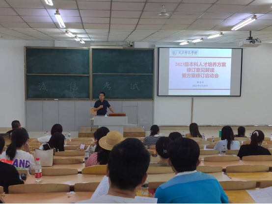 之后,张国发副处长介绍了2023级人才培养方案重要调整之处:一是积极呼应团委《第二课堂成绩单》工作,在人才培养方案中体现第二课堂要求,统筹做好第二课堂课程化建设;二是基于服务专业培养的视角,调整通识必修课,取消《大学英语》分层次教学,并相应调整各学期学分;三是加强专业选修课的模块化课程建设,为微专业建设、辅修专业建设打好基础;四是取消教师教育课程选修模块,并新增《教育研究方法》必修课;五是对实践教学环节做了调整;六是明确人才培养方案制定的组织实施,提高人才培养方案制订和实施的权威性。