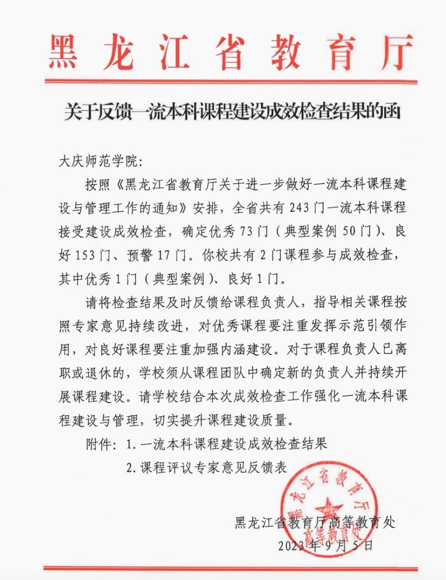 日前,全省一流本科课程建设成效检查结果公布,《铁人精神育人》国家社会实践一流课程建设成效检查结果获评优秀等级(典型案例)。此次全省共有243门一流本科课程接受建设成效检查,确定优秀73门(典型案例50门)、良好153门、预警17门。