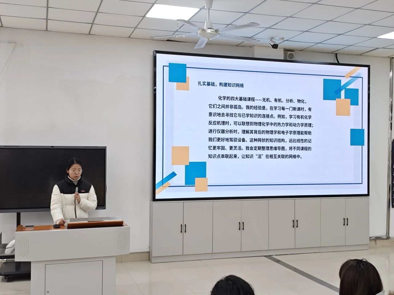 任杭从学习和科研两个方面来分享她的经验。她说这份荣誉是对她过往努力的肯定,也是新的起点。在学习上,她注重把无机化学、有机化学、分析化学、物理化学等课程,通过思维导图关联知识体系,深挖化学逻辑与机理;科研中,她把一次次实验的失败当作反馈,不断分析改进,同时坚持严谨规范,做好实验记录、设计对照实验、规范操作流程,培养科学态度与科研能力。她希望今天的分享能激励大家保持热爱、脚踏实地、勇于探索,在专业道路上不断成长。
