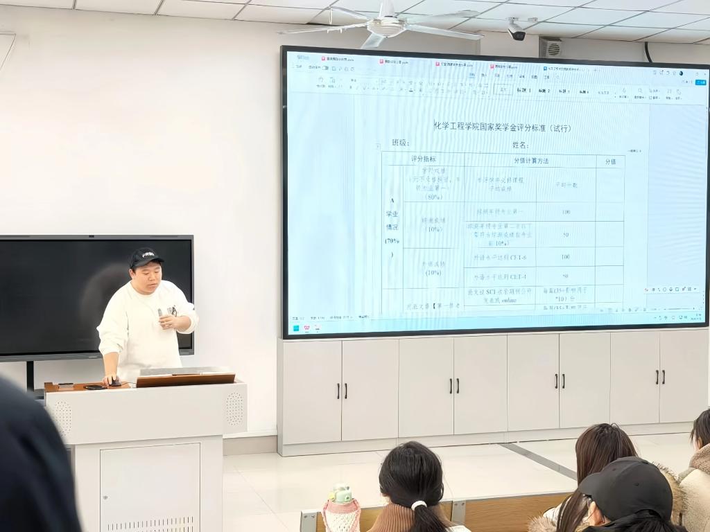 最后,邵子益为同学们详细解读了化学工程学院国家奖学金的评审细则与评分标准,从学业成绩、科研竞赛、综合素质、实践经历等多个维度进行了全面细致的讲解,帮助大家清晰了解评选要求、明确努力方向,为后续合理规划大学生活、冲刺更高荣誉提供了具体指引。